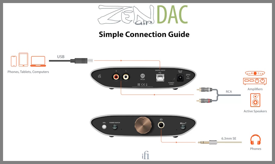 ZEN Air DAC hem DAC hem de kulaklık amplifikatörü olarak işlev görür. Ses yolculuğunuza yeni başlıyorsanız harika bir ilk adımdır. USB kablosuyla bilgisayarınıza veya akıllı cihazınıza bağlamanız yeterlidir. Ardından, ön taraftaki kulaklık girişi aracılığıyla kulaklığınıza veya arka taraftaki RCA bağlantıları aracılığıyla hoparlörlere bağlayın . Zaten bir amplifikatörünüz varsa, ZEN Air DAC'yi bu amplifikatör veya hoparlörlerle saf bir DAC olarak kullanabilirsiniz.