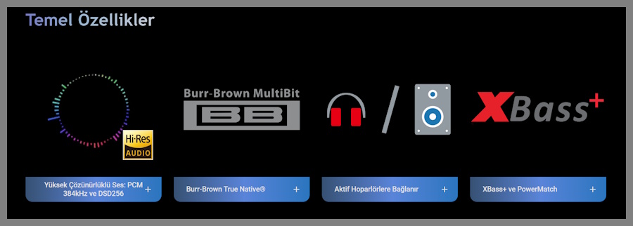 DSD (Doğrudan Akış Dijital) - DSD64, 128 ve 256 gibi örnekleme hızlarıyla üstün ses kalitesi sağlar. "Tamamen doğal" özelliği, orijinal kaydın değiştirilmemesini sağlar.