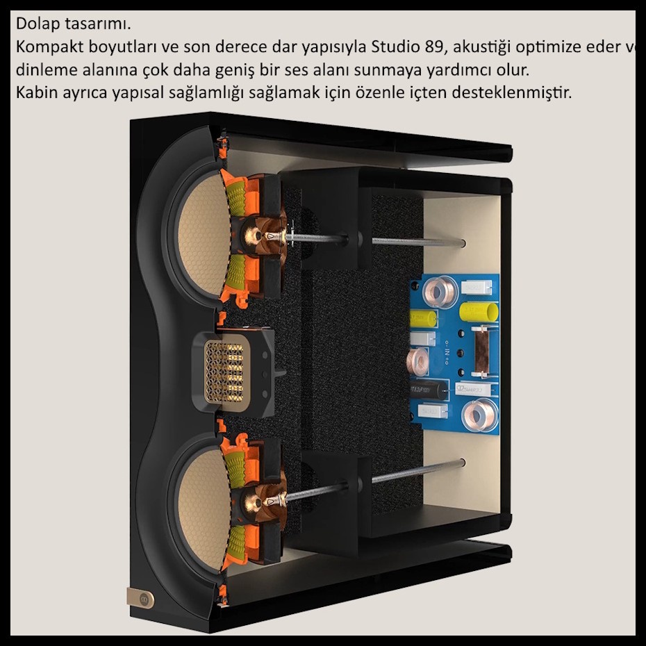 Studio 89'un kabini, altın renkli sürücü üniteleriyle birlikte koyu parlak siyah bir boyayla kaplanmıştır. Bu, orijinal Studio Serisi'nde bu şık kombinasyonla sunulan tek model olan ikonik Studio 15'e bir göndermedir.
