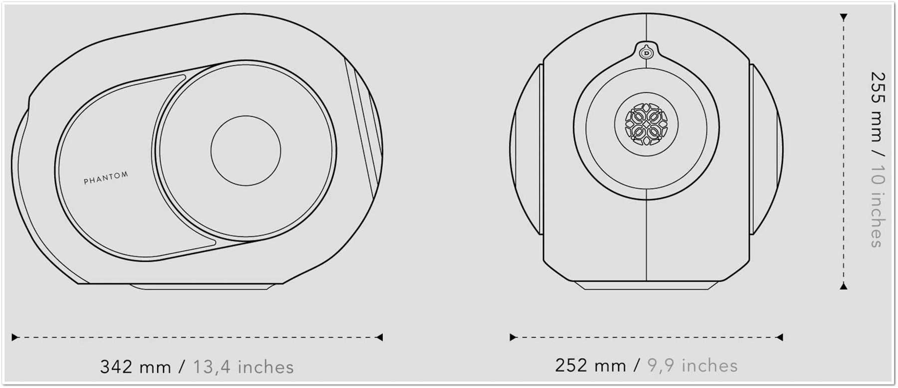 Devialet Gold Phantom 1 hoparlör sistemi 4500 Watt çıkış gücüne, 14 Hz ile 27000 Hz arasında frekans yanıtına ve 108 dB çıkış seviyesine sahiptir .