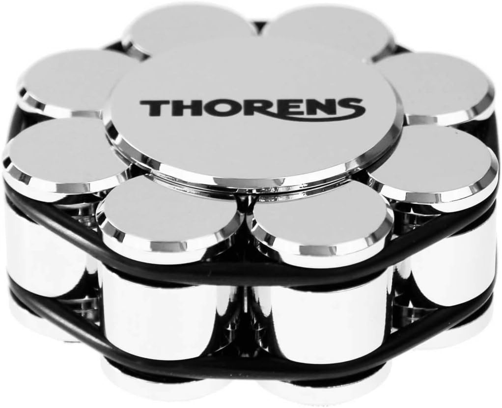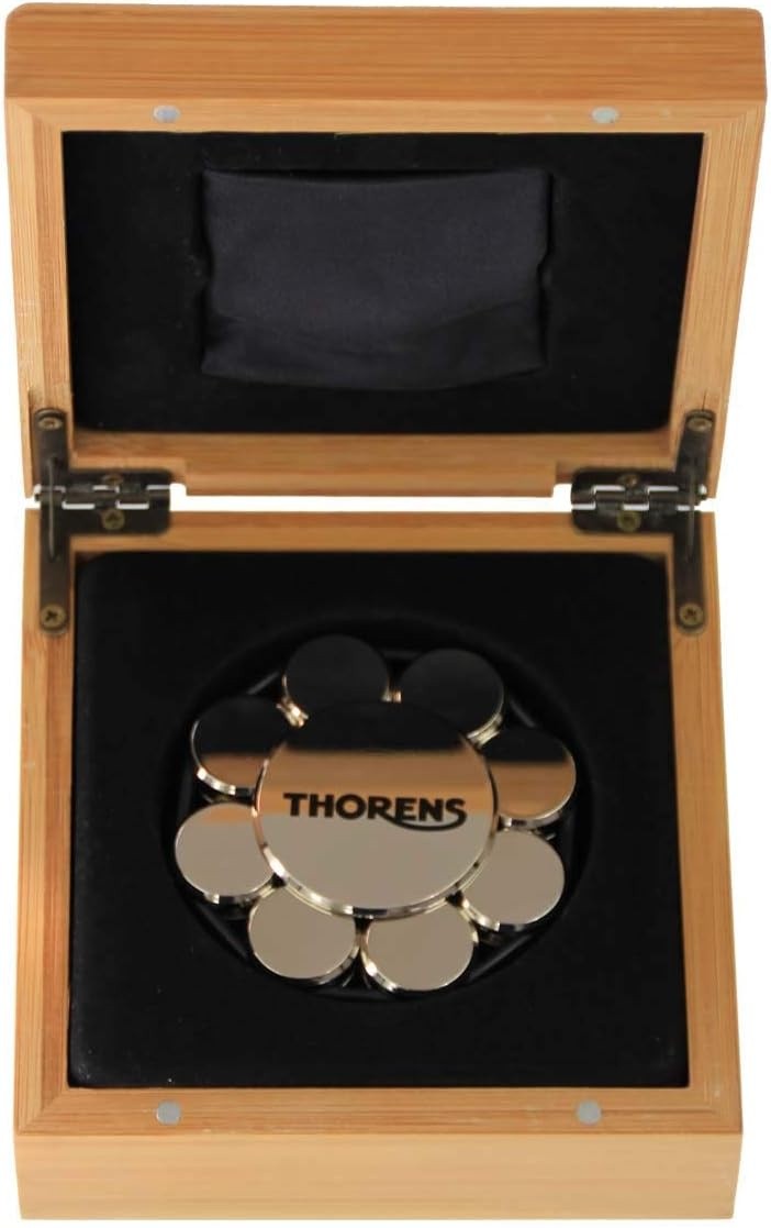 Thorens Stabilizatörü plağı tepside tutar ve küçük sapmaları azaltmaya yardımcı olur, bu da iğnenin plak oluklarını daha doğru bir şekilde izlemesine ve daha fazla ses detayı ve armoniklerle daha iyi bir ses sunmasına yardımcı olur.